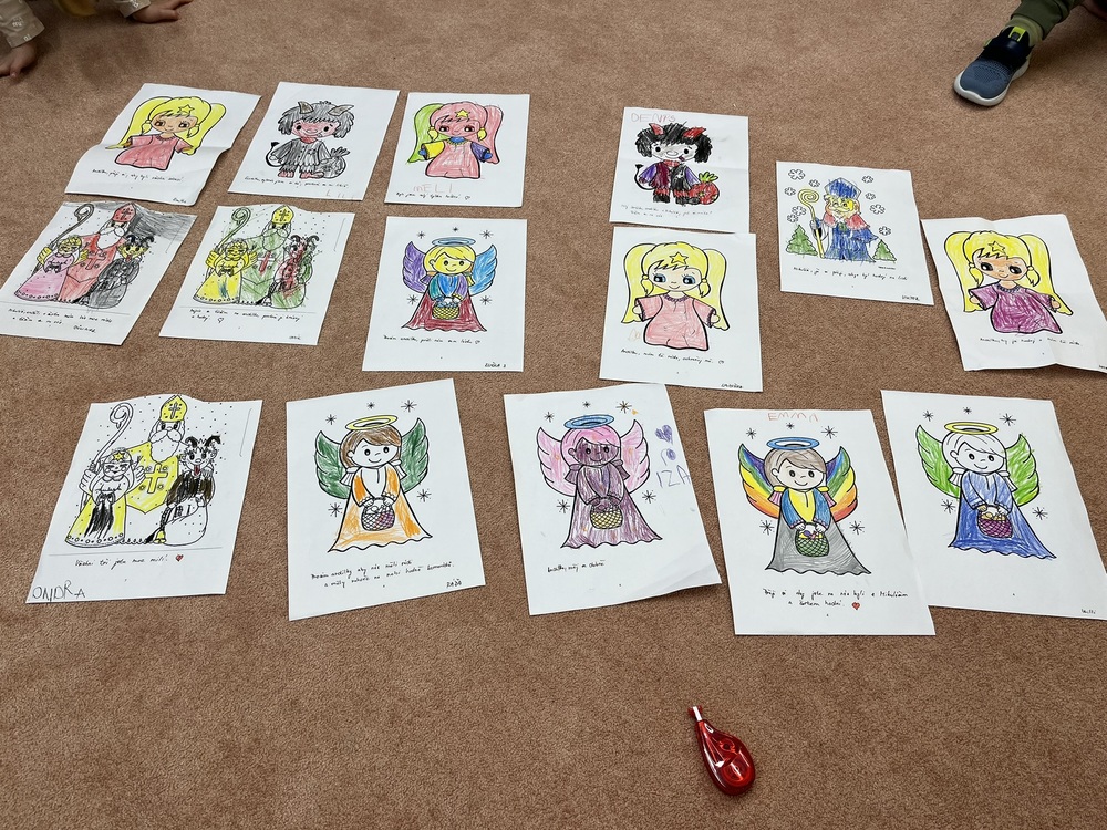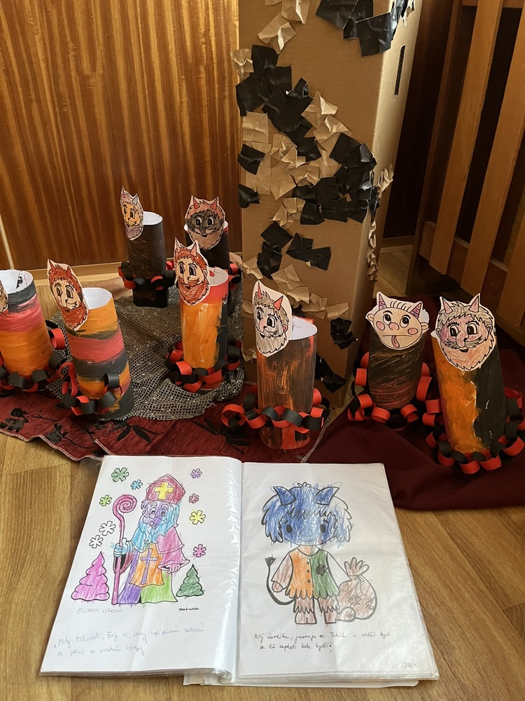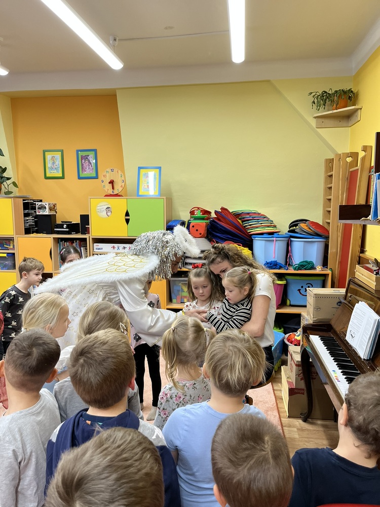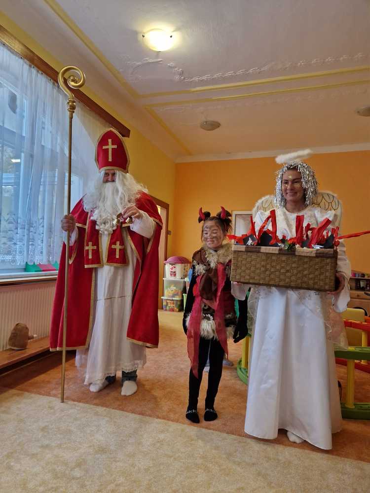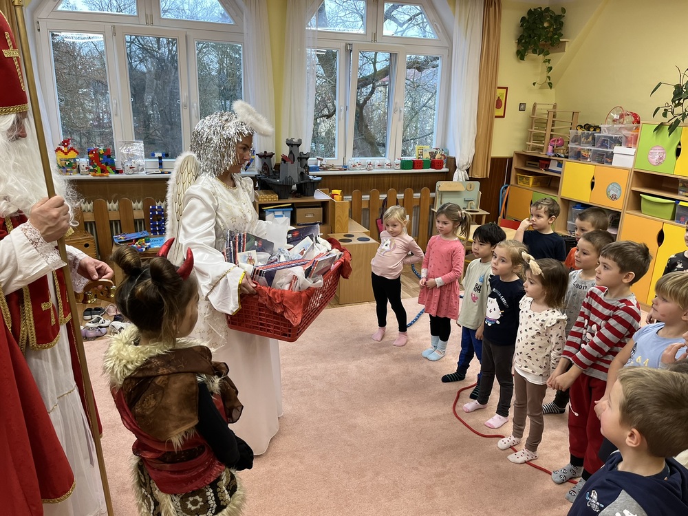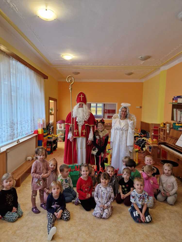 Tradiční akcí v naší školce je Mikulášská nadílka. Již druhým rokem nám s ní pomáhá rodina Dusových a kostýmy nám zprostředkovává pan Malý z Divadla B.N., za čež jim velmi děkujeme. Děti byly nadšené.